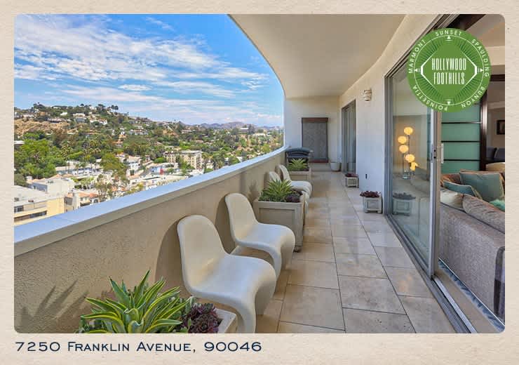 From the penthouse at 7250 Franklin Avenue–#1201 to be precise–there’s a unique perspective of the celeb-studded Hollywood Foothills with its confluence of urban lights and canyon switchbacks rising up to the celebrated iconic ridge. It’s the kind of experience one gets when you’re above it all.